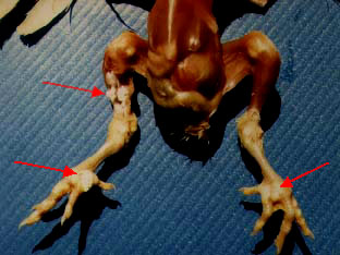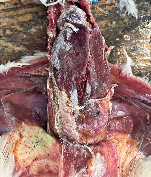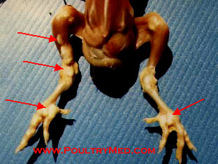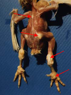 Soft tissues around the joints, surface of muscles and joints involved in a case of gout in 7 days old chick.