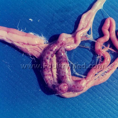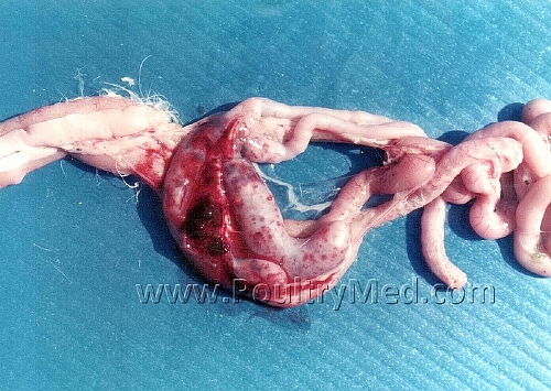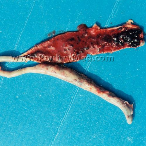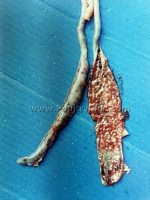 Eimeria tenella: Severe hemorragic enteritis. Erosions of the caeca mucosa.