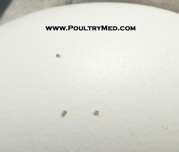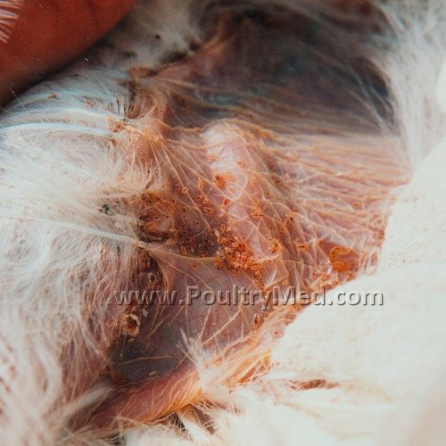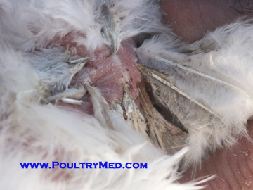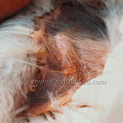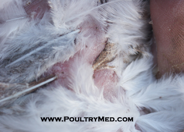 Darkened feathers due to a heavy infestation in the vent area of a laying hen