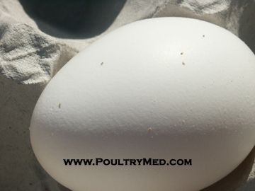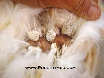 Masses of eggs of chicken lice on the shafts of the feathers.