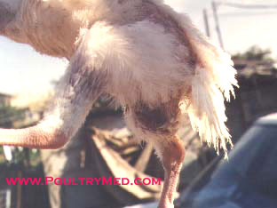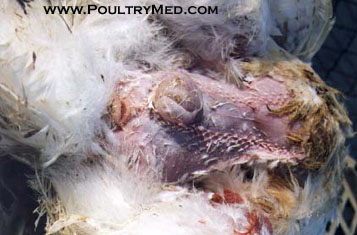 Ventral view of an 9-week-old turkey with an umbilical hernia.
