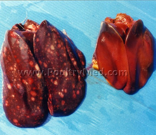 A marked enlargement of the liver. Diffuse greyish-white foci (tumour).