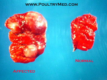 Large abscesses in the lungs of a 12 days old affected chick. This is one of the most common characteristics of pullorum disease in chickens. Labored breathing can be observed in affected flocks due to the extensive lesions in the lungs.
