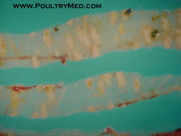 Intestinal lesions of pullorum disease are rare in chickens but are quite common in turkey poults.The lesions are characterized by ulceration and plaque like accumulation of necrotic tissue in the duodenum.