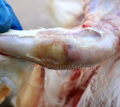 Rupture of the gastrocnemius is accompanied by haemorrhage which in turn causes green discolouration of the skin at the joint.