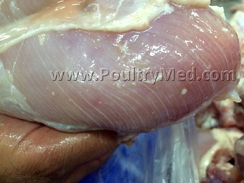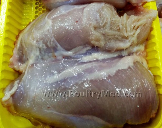 Breast muscle from 42-day-old broiler. Muscle is pale with an exudate over the surface.