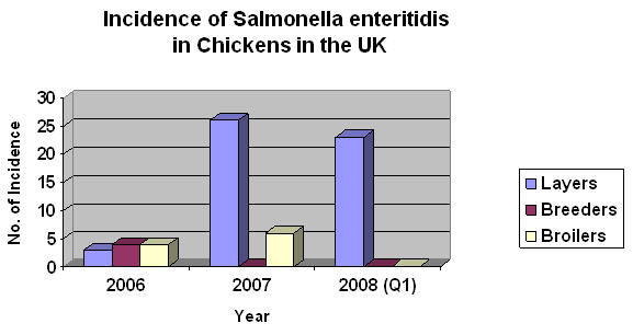 According to the surveillance report published by the Veterinary Laboratories Agency (May 2008), an increasing number of salmonella enteritidis isolates has been recorded in the first quarter of 2008. All incidences were reported in commercial layers flocks, producing eggs for human consumption.