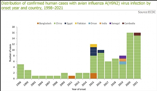 As of 16 November 2021 and since 1998, a total of 94 laboratory-confirmed cases of human infection with avian influenza A(H9N2) viruses have been reported, from China (82), Egypt (4), Bangladesh (3), Cambodia (1), Oman (1), Pakistan(1), India (1), and Senegal (1). Most of the cases were children with mild disease.