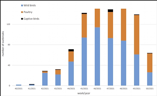 The 2021 avian influenza epidemic in European Countries appears to be one of the largest HPAI epidemics that has ever occurred in Europe. HPAI virus detections were reported in wild birds and poultry in Czech Republic, Denmark, Estonia, Finland, Germany, Ireland, Italy, Poland, The Netherlands, Sweden, Ukraine, Bosnia and Herzegovina, Hungary, Norway, France, Romania, Belgium, Bulgaria, Croatia, Slovakia, Switzerland, Austria, Luxembourg, Portugal, Northern Ireland, UK, Russia and Greece. As of December 12, a total of 1,516 HPAI outbreaks in poultry had been reported to the EC by 22 European states.