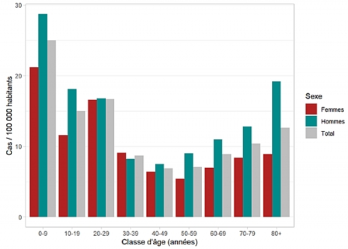 a predominance of infections in men, except in people aged 30 to 39;a seasonal peak during the summer period;