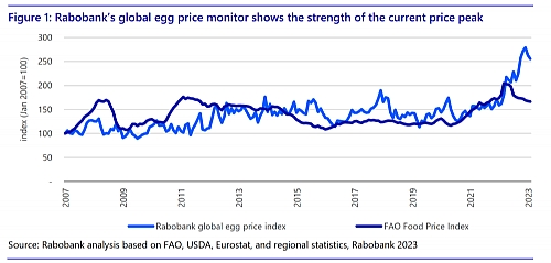 Global egg prices have reached historic highs, significantly impacting the global egg supply. It is uncertain how long this situation will last and whether there are ways to stabilize the supply. However, it is anticipated that prices will remain relatively high throughout 2023, particularly in markets heavily affected by avian influenza, high costs, and regulatory changes. While some markets may experience a slight decline in prices, they are not expected to return to pre-2021 levels due to persistent high input costs. To stabilize the markets, better value chain cooperation, including greater commitment from buyers to mitigate farmers' production risks, is considered a crucial tool. Additionally, improving control over avian flu in heavily affected countries is another key strategy. Rabobank's global egg price monitor has reached a new record in Q1 2023, with the index exceeding 250. This indicates that prices are 2.5 times higher than the reference year of 2007 and have increased by over 100% compared to the same period last year. Significant price increases have been observed in various markets, including the US, EU, Japan, Thailand, the Philippines, Israel, New Zealand, Nigeria, Kenya, Brazil, Mexico, and Argentina. These price surges have had a substantial impact on all stakeholders in the egg supply chain, from breeders and producers to customers in retail, foodservice, and food processing sectors.