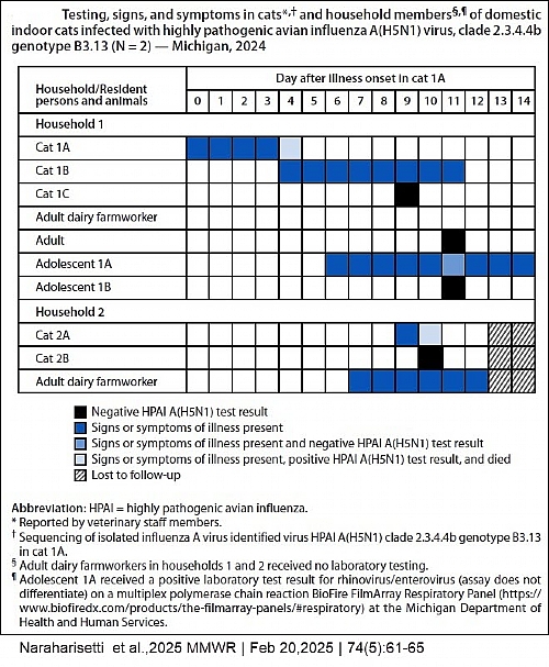 The article titled "Highly Pathogenic Avian Influenza A(H5N1) Virus Infection of Indoor Domestic Cats Within Dairy Industry Worker Households — Michigan, May 2024" was published in the Morbidity and Mortality Weekly Report (MMWR) by the U.S. Centers for Disease Control and Prevention (CDC) on February 20, 2025. This report elucidates a public health investigation into instances of highly pathogenic avian influenza (HPAI) A(H5N1) virus infection identified in two exclusively indoor domestic cats residing in households of dairy workers in Michigan.