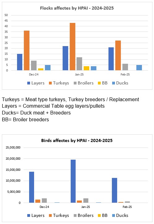 The primary poultry involved are commercial table egg layers, primarily due to the size of their flocks. However, when considering outbreak hotspots, most are found in turkey flocks.